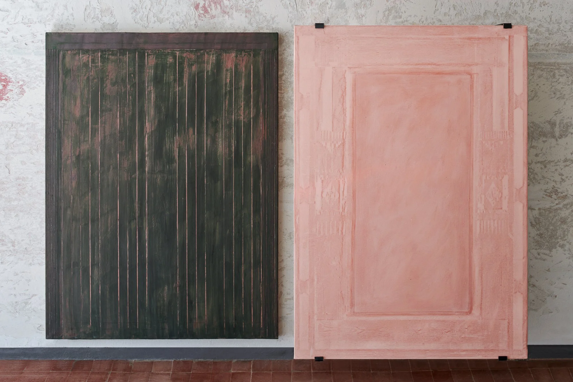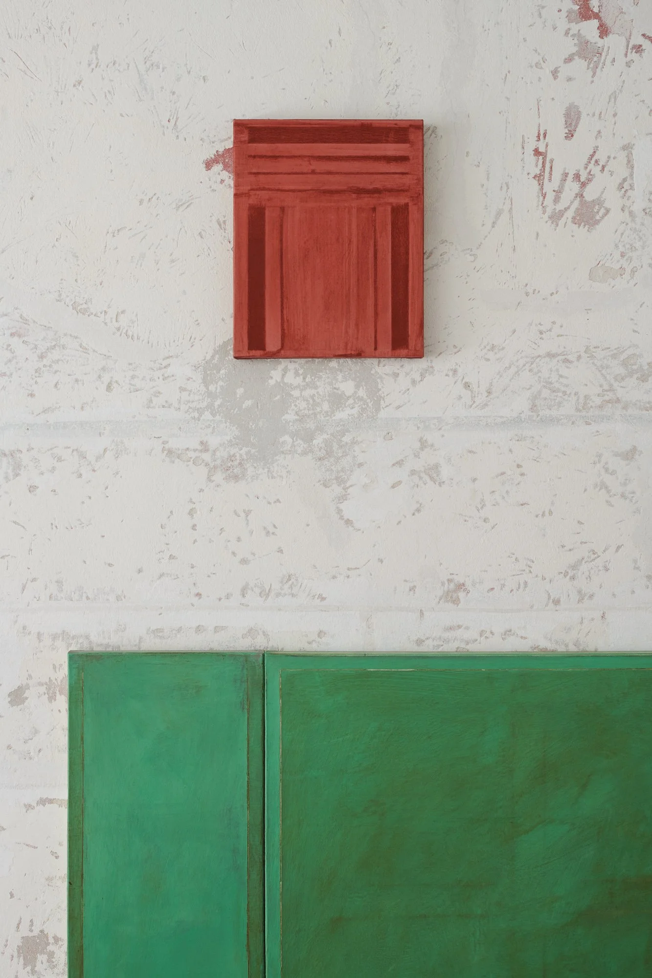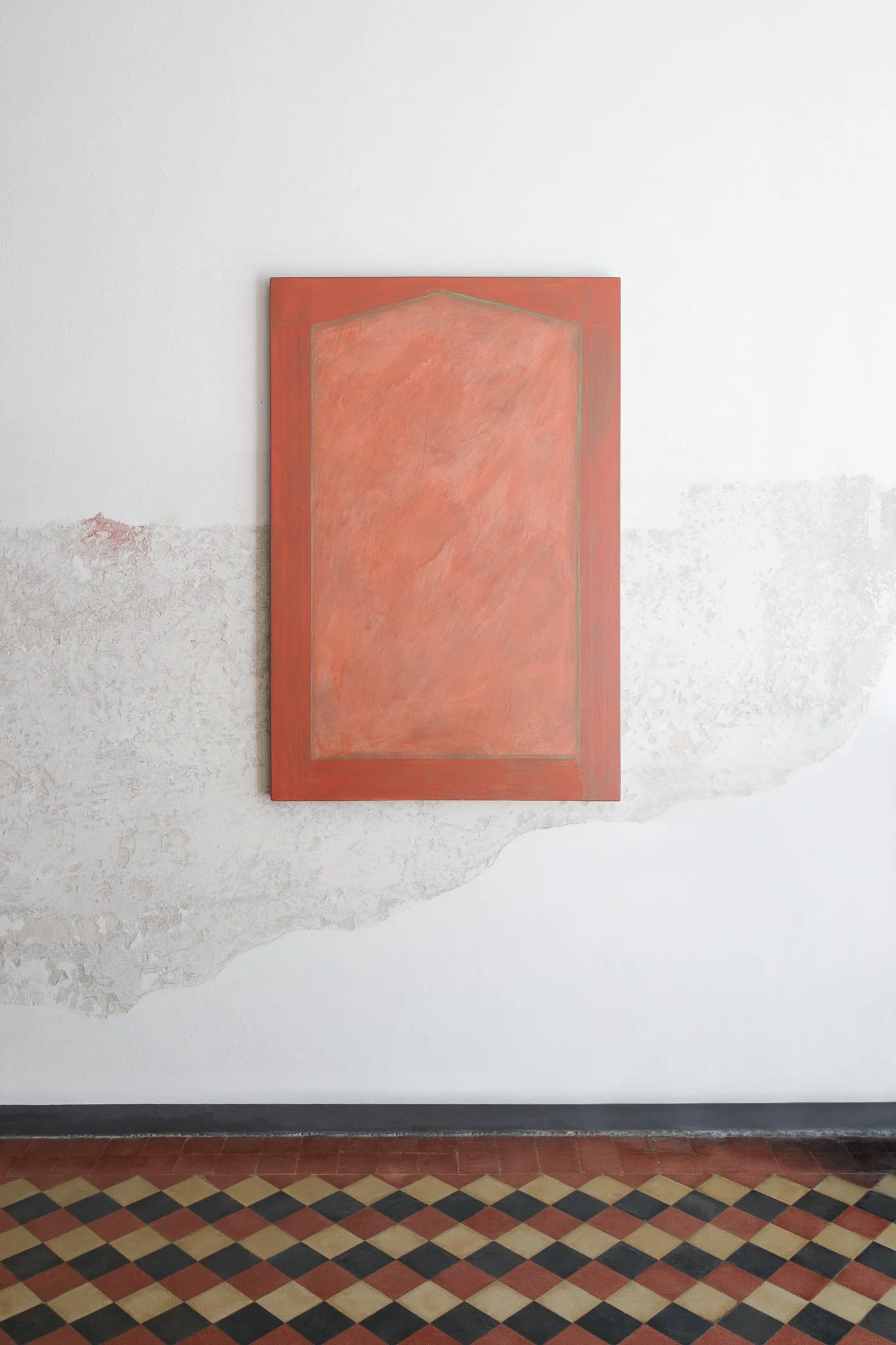 In these works the painted canvas acts as a filter, a skin, negotiating how much of the physical reality of the support is let through. They are made with the persistent presence of the underlying support; the abrasive handling of paint is like rubbing against skin, locating the bones of the substructure, gradually developing an imprint of reality. The works appear as patches of skin reminding of the body they were removed from — that is the architectural space in which these originated: the basement as a place with little connection to the outside, a kind of illusionary space, mirroring and extending the function of the painted surface.
