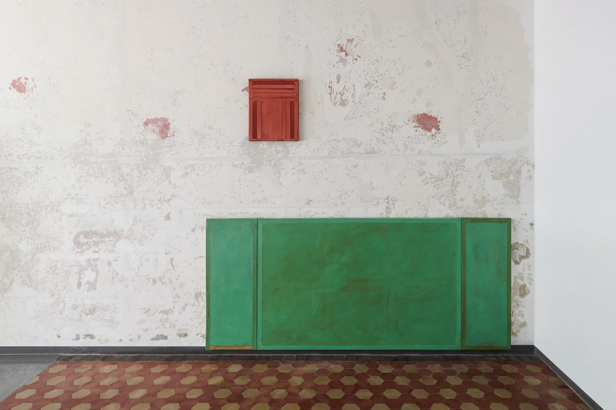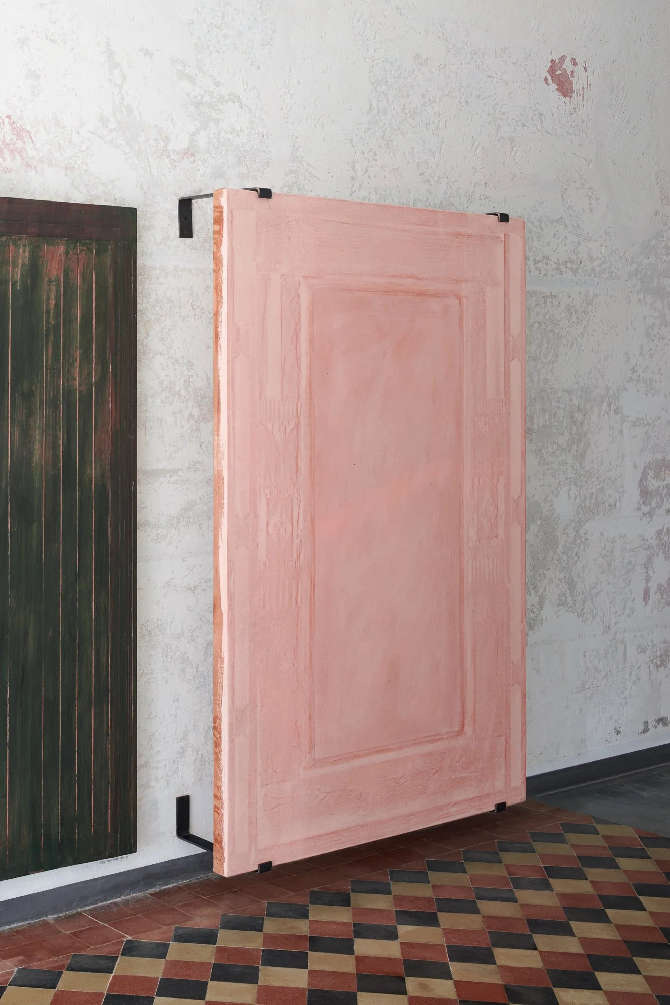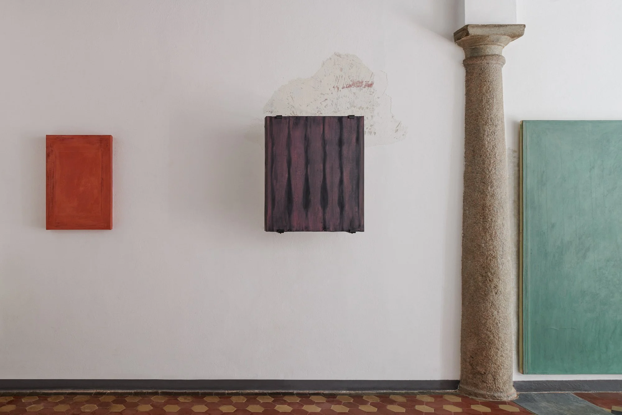In these works the painted canvas acts as a filter, a skin, negotiating how much of the physical reality of the support is let through. They are made with the persistent presence of the underlying support; the abrasive handling of paint is like rubbing against skin, locating the bones of the substructure, gradually developing an imprint of reality. The works appear as patches of skin reminding of the body they were removed from — that is the architectural space in which these originated: the basement as a place with little connection to the outside, a kind of illusionary space, mirroring and extending the function of the painted surface.